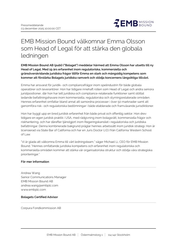 EMB Mission Bound AB (publ) (“Bolaget”) meddelar härmed att Emma Olsson har utsetts till ny Head of Legal. Med 19 års erfarenhet inom regulatoriska, kommersiella och gränsöverskridande juridiska frågor tillför Emma en stark och mångsidig kompetens som kommer att förstärka Bolagets juridiska ramverk och stödja koncernens långsiktiga tillväxt.